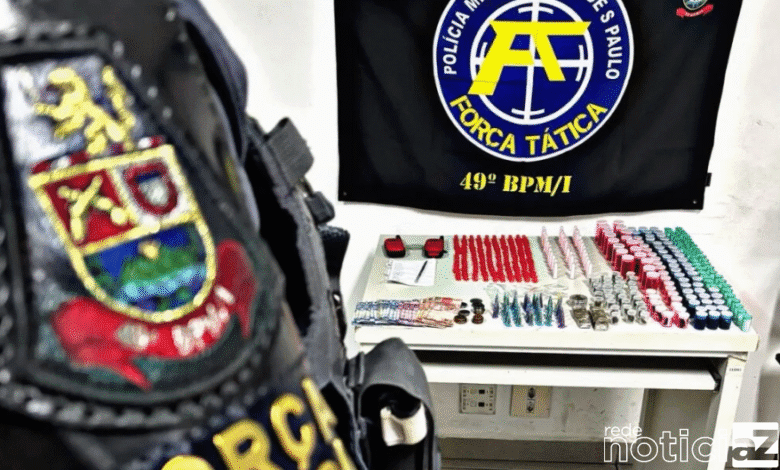 Ao perceber a presença dos policiais, o suspeito tentou fugir, mas foi rapidamente detido. Na mochila, foram encontradas: 160 porções de maconha, 78 porções de cocaína, 243 pedras de crack, 16 porções de “dry”, 2 rádios comunicadores e R$ 75,40 em dinheiro.