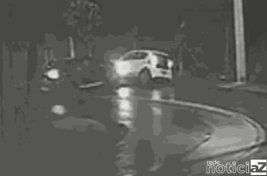 Imagens de câmeras de segurança mostram o momento em que o carro preto faz a curva na contramão e atinge um veículo branco que vinha no sentido contrário.