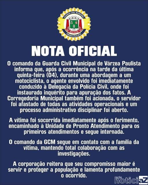 A Guarda Civil Municipal (GCM) de Várzea Paulista se manifestou oficialmente após um motoboy de aplicativo ser baleado durante uma abordagem na tarde de quinta-feira (4). Em nota, o comando informou que o agente envolvido foi levado imediatamente à Delegacia da Polícia Civil, onde foi instaurado inquérito para apuração dos fatos.