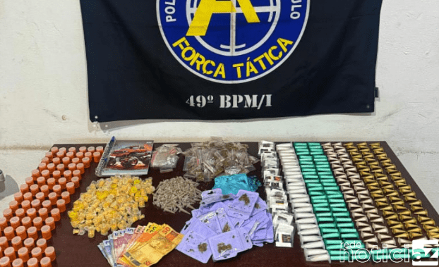 Dentro da mochila, a PM encontrou 324 porções de maconha, 298 de cocaína, 199 pedras de crack, 36 porções de Ice, além de um celular e um caderno com anotações do tráfico.