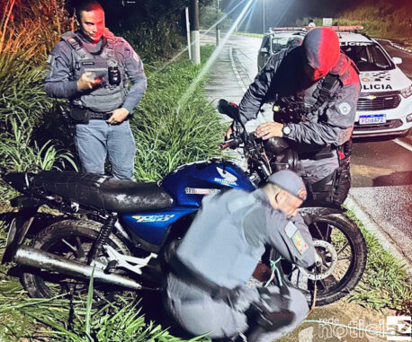 Após o registro da ocorrência, as equipes iniciaram diligências imediatas e montaram um cerco policial, considerando possíveis rotas de fuga pela rodovia e vias do município. Durante o patrulhamento, os policiais acessaram a Avenida Juvenal Ferreira dos Santos, ponto já conhecido pelo abandono de veículos roubados, onde localizaram a motocicleta escondida em uma área de mata.