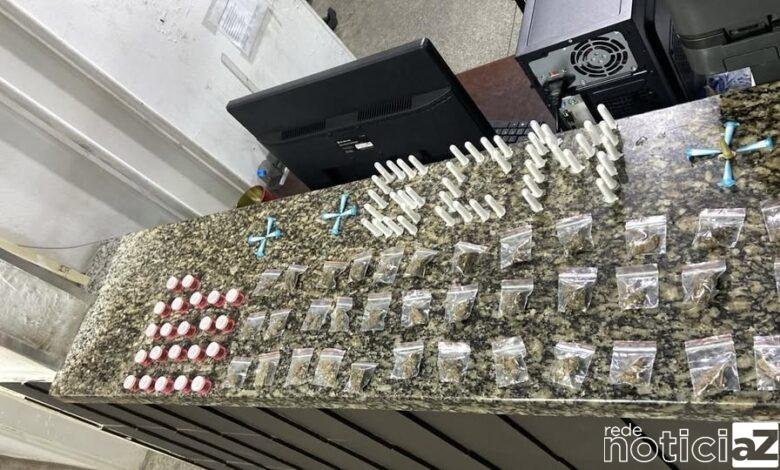 Durante a busca pessoal, os guardas localizaram porções de substâncias análogas à cocaína e à maconha escondidas nas vestes do indivíduo. Questionado, o suspeito confessou que realizava o tráfico de drogas no local.