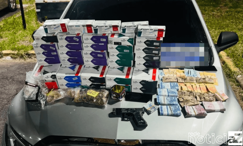 Apesar da fuga, dois envolvidos foram detidos, incluindo um homem que já era procurado pela Justiça. Com eles, foram recuperados o veículo furtado, um simulacro de arma de fogo, dinheiro e toda a mercadoria roubada da farmácia.