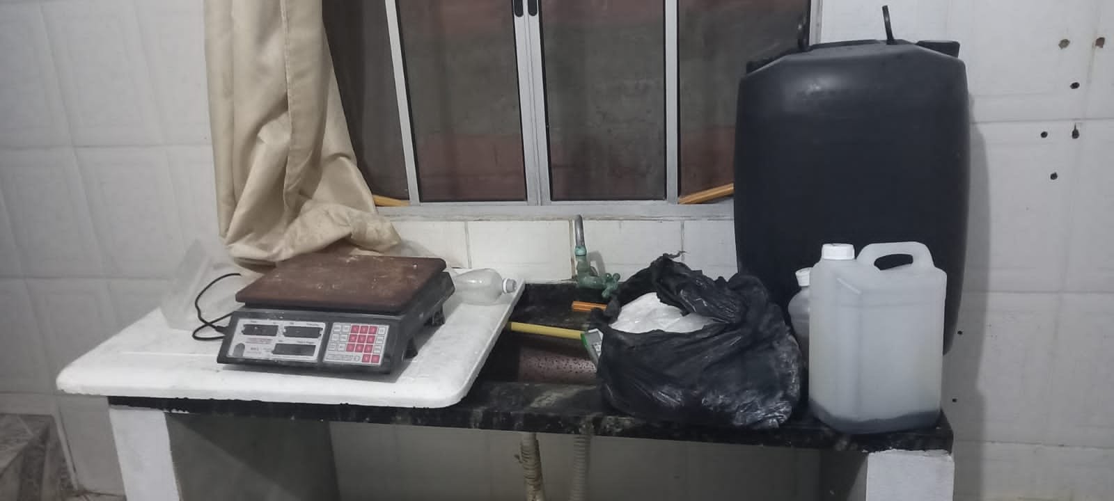 Os policiais realizaram a aproximação para abordagem, porém os indivíduos ao perceberam que seriam abordados empreenderam fuga pela viela. A equipe com intuito de localiza-los adentrou a viela onde percebeu em uma residência abandonada, pela fresta da janela, uma máquina industrial e diversos invólucros com substância análoga a cocaína.