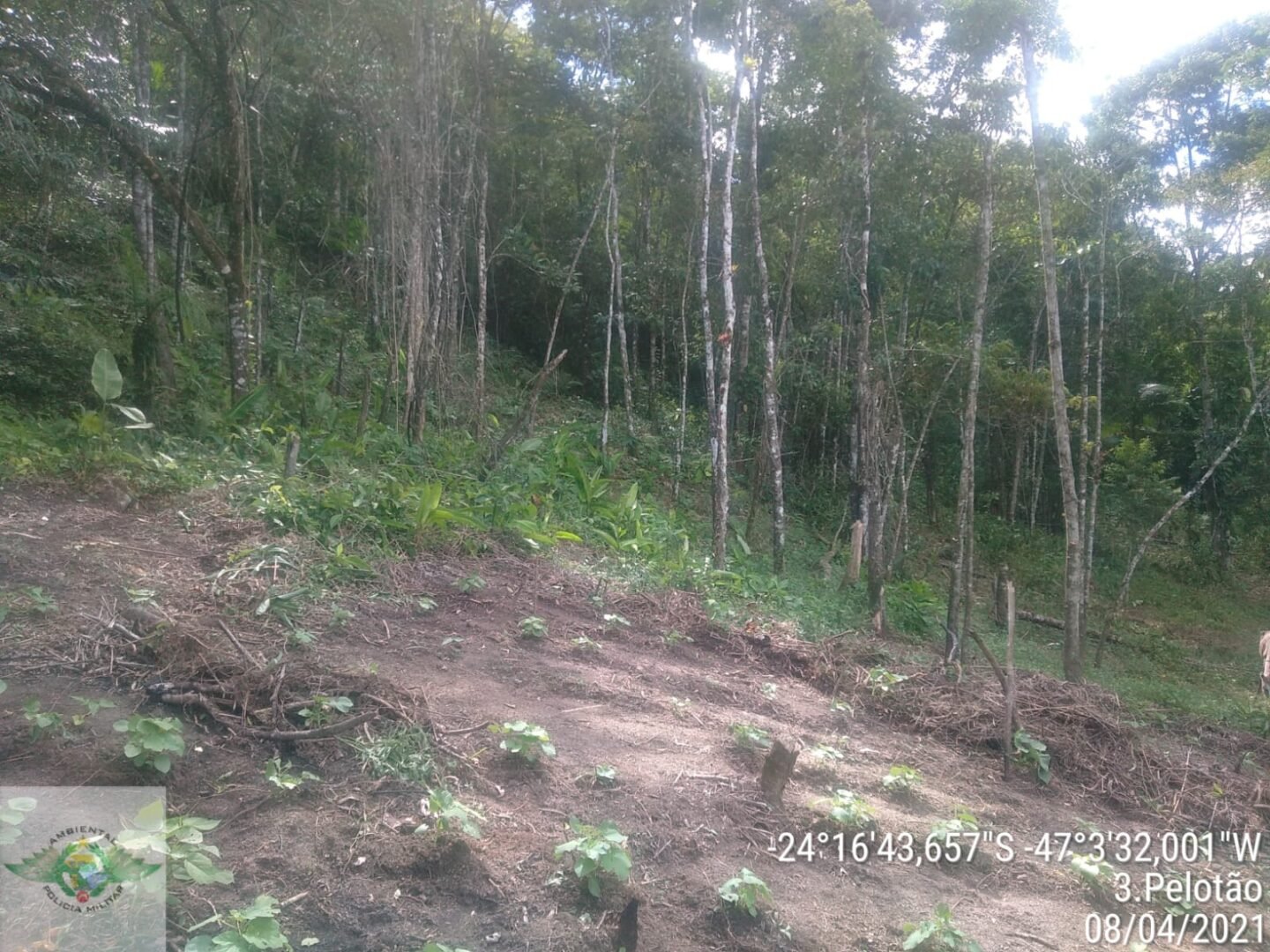 E esta ocorrência foi em Pedro de Toledo, na região do Núcleo Itariru. Segundo informações, os policiais receberam uma denúncia anônima dentro de um sítio, onde uma área estava sendo desmatada sem qualquer autorização de algum órgão ambiental.