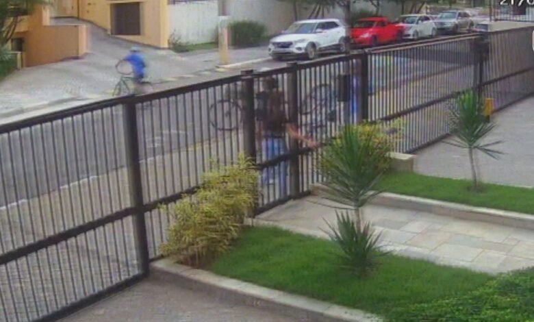 Câmeras de monitoramento flagraram o momento em que uma jovem de 20 anos arremessou o próprio celular através do portão de um prédio para escapar de um assalto em Guarujá. Ela e o namorado foram cercados por três criminosos, e o jovem chegou a entrar em luta corporal com os suspeitos.