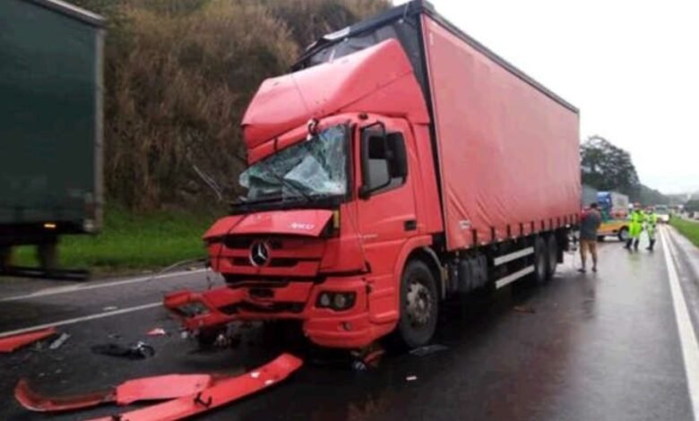 Carreta e caminhão se envolvem em acidente que interditou as duas faixas da Rodovia Régis Bittencourt, perto de Miracatu, na manhã desta terça-feira. De acordo com a Arteris, concessionária responsável pelo trecho, o tráfego segue pelo acostamento e há lentidão no local.