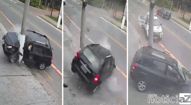As câmeras de segurança da região capturaram o exato momento em que o carro roubado chocou-se com o poste, ilustrando vividamente a intensidade da perseguição policial. A ocorrência mais uma vez destaca a importância do rápido acionamento das autoridades e ressalta os riscos associados a fugas após crimes.