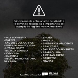 Defesa Civil do Estado de São Paulo divulgou as regiões que podem sofrer com os fortes ventos