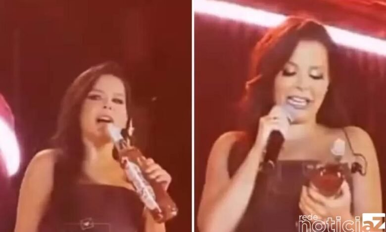 De acordo com as informações, a sertaneja está cantando em cima de um palco e chega a beber o líquido da garrafa e quando volta a cantar, usa como microfone a garrafa.
