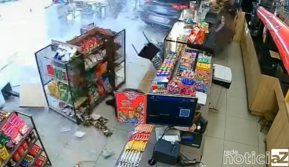Imagens de câmeras de segurança mostram o veículo passando pela área das bombas antes de perder o controle e avançar contra a loja, quebrando o vidro e derrubando gôndolas.
