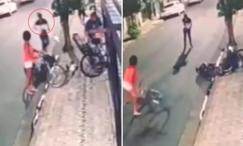 De acordo com as informações, o homem estava na rua com o seu filho na cadeirinha de sua bicicleta quando um homem aparece e atira.
