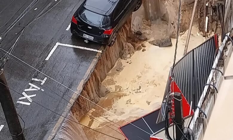 Uma cratera chegou a se abrir ao lado de um veículo é no bairro Gonzaga e travessia de balsas registrou espera de 100 minutos.