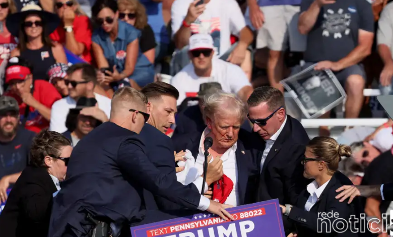 Durante o ataque, Trump foi imediatamente escoltado para fora do palco por seguranças. Imagens do evento mostram o que parece ser sangue na orelha do ex-presidente. O Serviço Secreto dos EUA garantiu que Trump está seguro e que medidas de proteção foram prontamente implementadas.