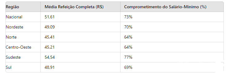 Isso significa que quem recebe cinco salários mínimos tem cerca de 15% de sua renda comprometida com as refeições de almoço e quem recebe três salários mínimos tem em média 24% de comprometimento. Já para quem tem uma remuneração de um salário mínimo, 73% da renda fica comprometida.