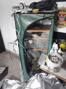 A Polícia Civil encontrou uma estufa de maconha em um imóvel de São Vicente nesta quinta-feira (14). O curioso é que ela foi montada dentro de uma sapateira, e continha termômetro, lâmpada e resfriador, além de um temporizador. Dois homens, de 50 e 24 anos, foram presos.