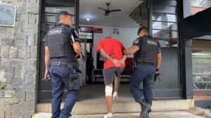 Eles foram revistados e, com eles, foram encontrados uma corrente, dois celulares e um revólver .32 com cinco munições intactas. Os dois foram levados à Delegacia Sede de Guarujá e a motocicleta encaminhada ao Pátio Municipal. O homem foi detido, já o adolescente foi apreendido.