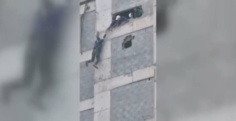 VÍDEO – Operário fica pendurado em prédio no litoral de SP e é salvo por colegas