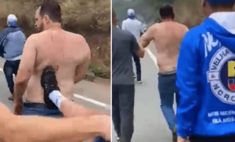 O vídeo que circula nas redes, mostra torcedores do Palmeiras, incluindo o presidente da Mancha Verde, Jorge Luis, caído ao chão e sendo agredido por rivais da Máfia Azul, assista: