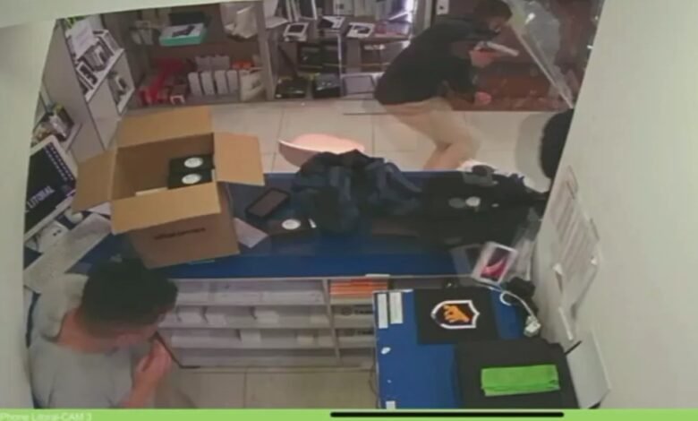 O caso ocorreu por volta de 20h desta segunda-feira (24). Nas imagens, é possível ver que o funcionário que fica no balcão do estabelecimento e oferece um produto à dupla. Nesse momento, um dos assaltantes mostra a arma.