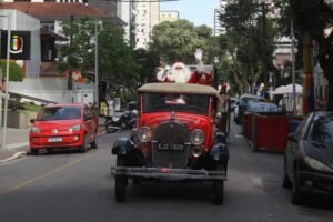 Nada melhor do que receber o Papai Noel com todas as honrarias necessárias. Em Santos, o Gonzaga foi palco da chegada do bom velhinho e com direito a um estiloso calhambeque vermelho que o trouxe até sua casa. Com pompa e música natalina, Papai Noel chegou à sua casa montada na Praça da Independência.