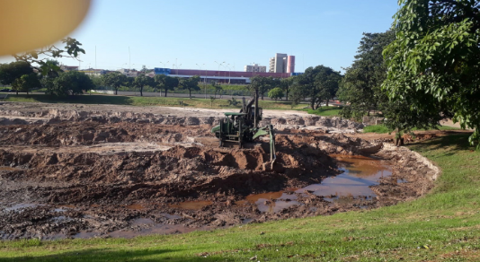 O trabalho de desassoreamento está sendo feito por dragas contratadas pela empresa Guepardo responsável pelos loteamentos, Jardim Botânico.