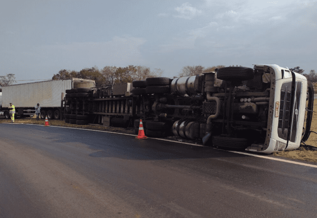 Acidente: caminhão carregado de carne tomba em alça de acesso de rodovia