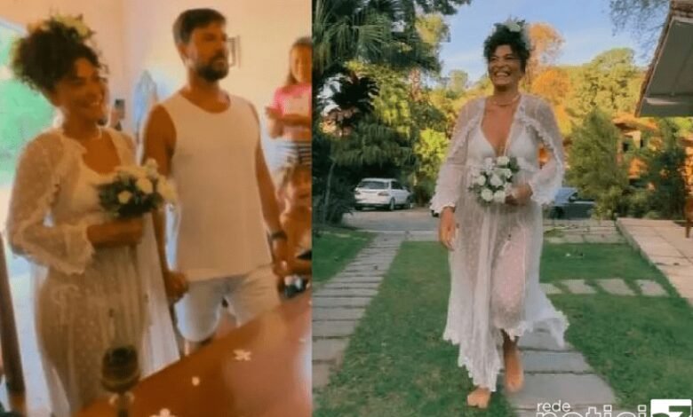 A cerimônia, que aconteceu em uma pequena capela na propriedade, foi capturada em uma emocionante imagem que mostra Juliana Paes subindo ao altar ao lado de seu pai, que enfrenta problemas de saúde. A atriz estava com um vestido branco transparente, usando um biquíni por baixo da peça, e carregava flores de plástico como buquê.
