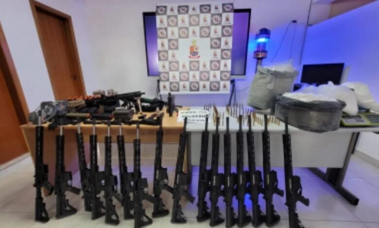 oram apreendidos 18 fuzis, munições, drogas, balança de precisão e máscara de gás