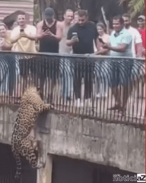 Com apenas três movimentos, a onça-pintada escalou uma pilastra localizada abaixo de um ponto onde os visitantes costumam se posicionar. Colocando as patas entre as grades, o animal observou os visitantes por alguns segundos antes de descer, momento em que um segurança interveio.