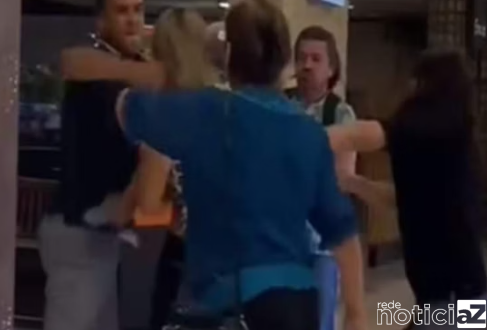 As imagens capturam o momento em que um dos homens agride uma das mulheres com vários socos no rosto, seguido por um confronto físico com o outro homem.